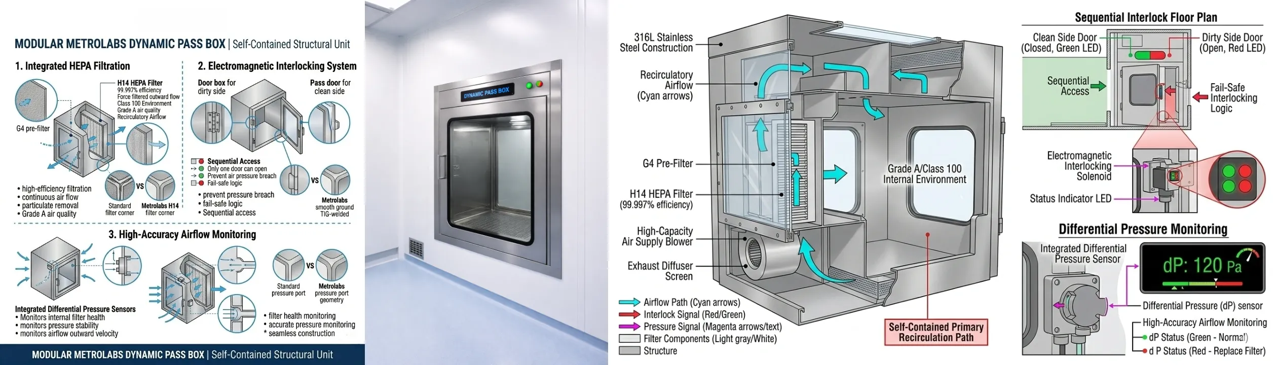 A Metrolabs Dynamic Pass Box is a self-contained structural unit that maintains a higher internal pressure than the surrounding rooms, ensuring a constant “outward” flow of air when doors are opened.