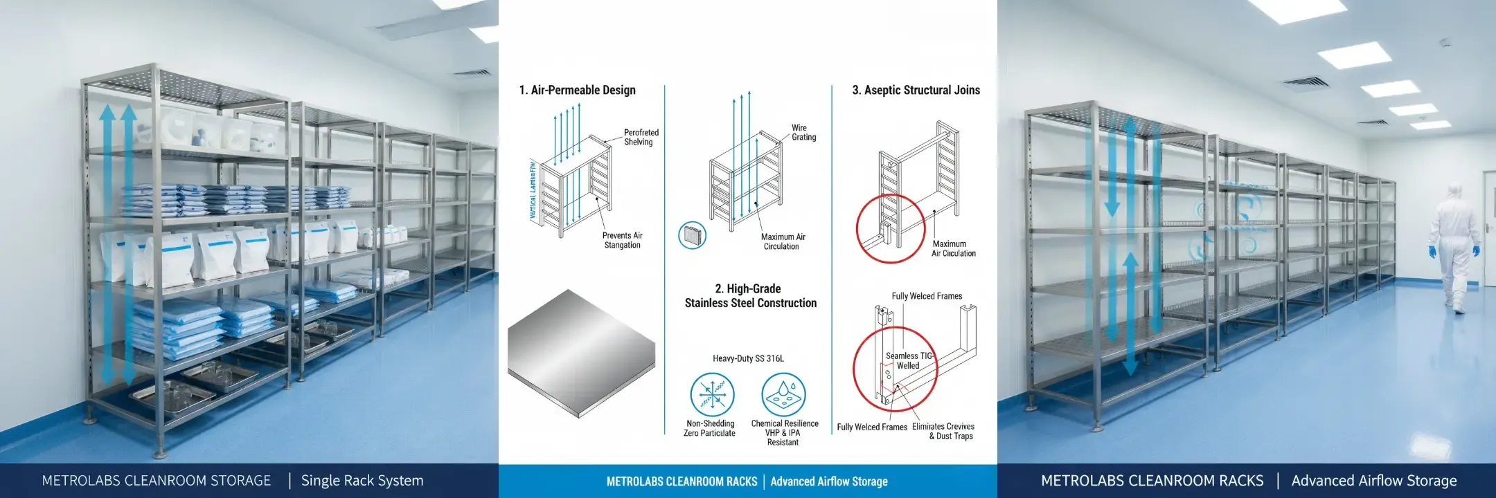 In a controlled environment, how you store raw materials, components, and finished products directly impacts your facility’s airflow and particulate count. Metrolabs provides high-accuracy Cleanroom Material Storage Racks, engineered to provide maximum storage density while supporting the “Zero-Ledge” hygiene standards of pharmaceutical, biotech, and semiconductor industries.