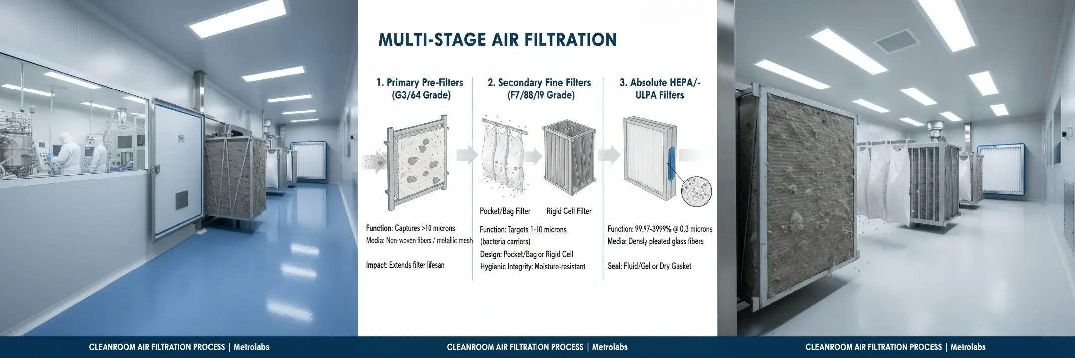 Air purification in a microbiology or pharmaceutical facility is a multi-stage process. Metrolabs utilizes a strategic layering of filter grades to ensure absolute air quality.