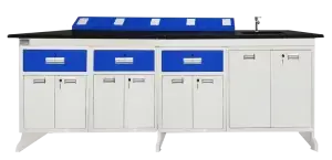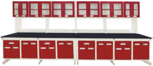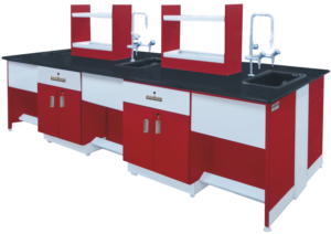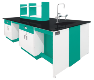 With higher storage spaces, the storage cabinets can be designed to be accessible from both sides. Power sockets, sinks, gas outlets, or reagent racks are provided as per customer requirements for each workstation. The island table can be sized to the lab’s needs and user ergonomics with knee hole space options or continuous models.